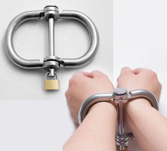 (1) Unisex Stainless Steel Irish 8 Handcuffs with Brass Lock. The maximal inside diameter is 6.8 cm.