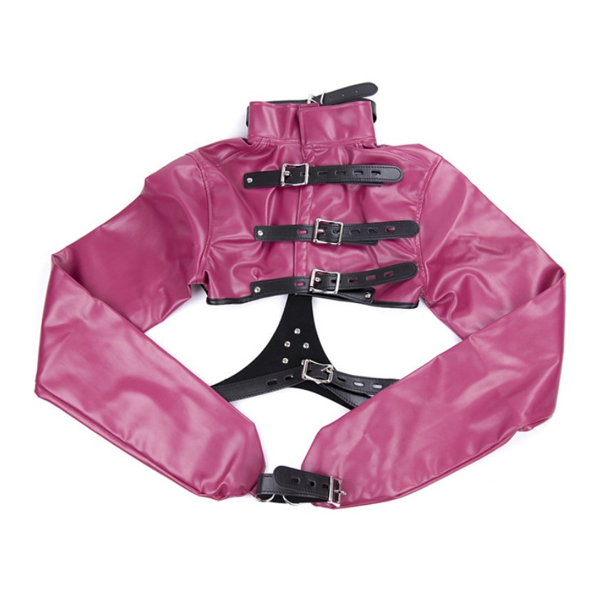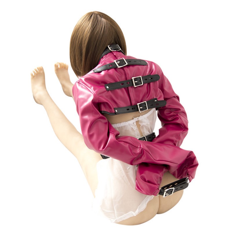 (1) Like a traditional straitjacket, it has a buckling collar and back closures in addition to the extra long glove-like sleeves that extend beyond the fingertips. The sleeves end with a small rectangular ring on one and a wide strap on the other.