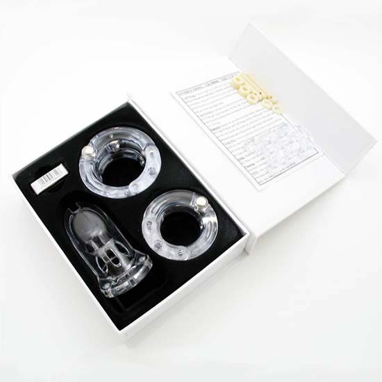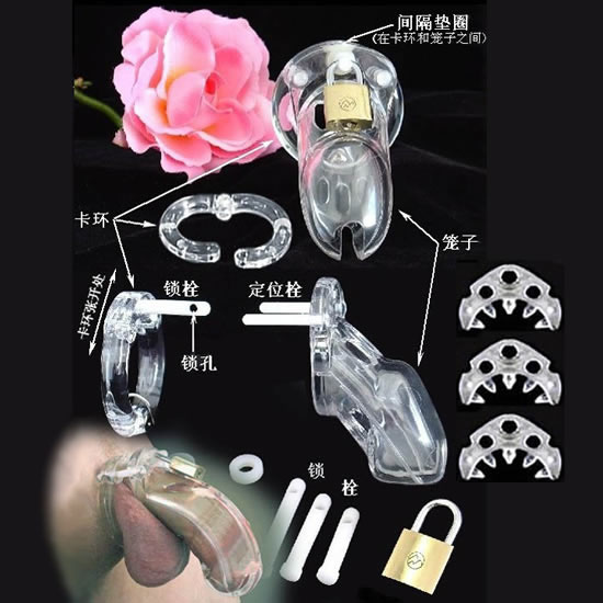 The cage portion has two guide pins and a locking pin hole. The cuff ring goes behind the ball sack and over the penis. Install the locking pin and the spacers. Put the cage over the penis and then line up the cage portion with the cuff ring. Slide the guide pins and locking pin into place and attach a lock on the tip of the locking pin. Once you have found the exact fit, cut the ends of the guide pins with a pair of side cutter pliers and smooth the edges with an emery board.